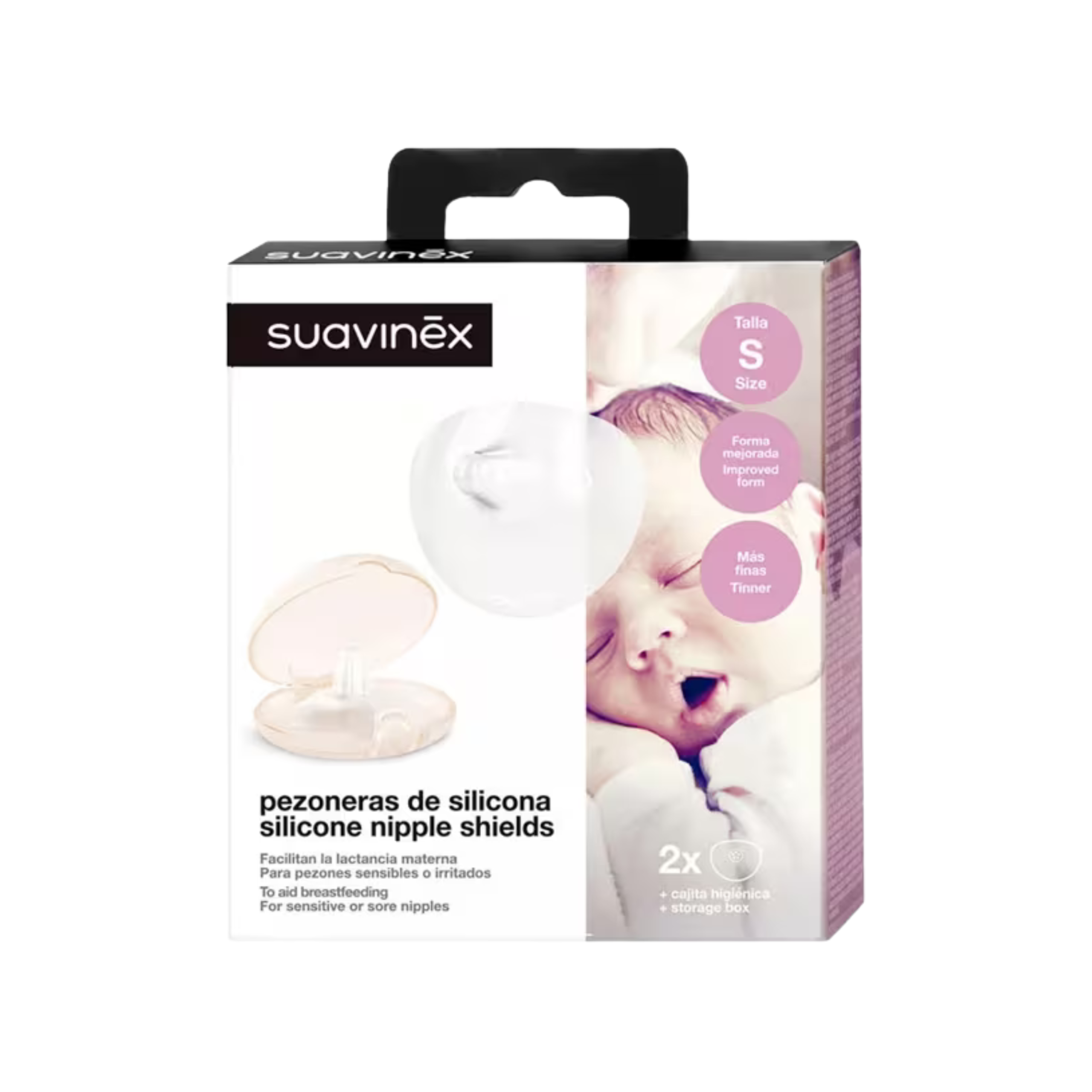 Suavinex Silicone Nipple Shields janë mbrojtëse për thithat e gjirit, të dizajnuara për të ndihmuar nënat gjatë gjidhënies kur hasin vështirësi si dhimbje, irritim apo kapje e dobët nga bebja.