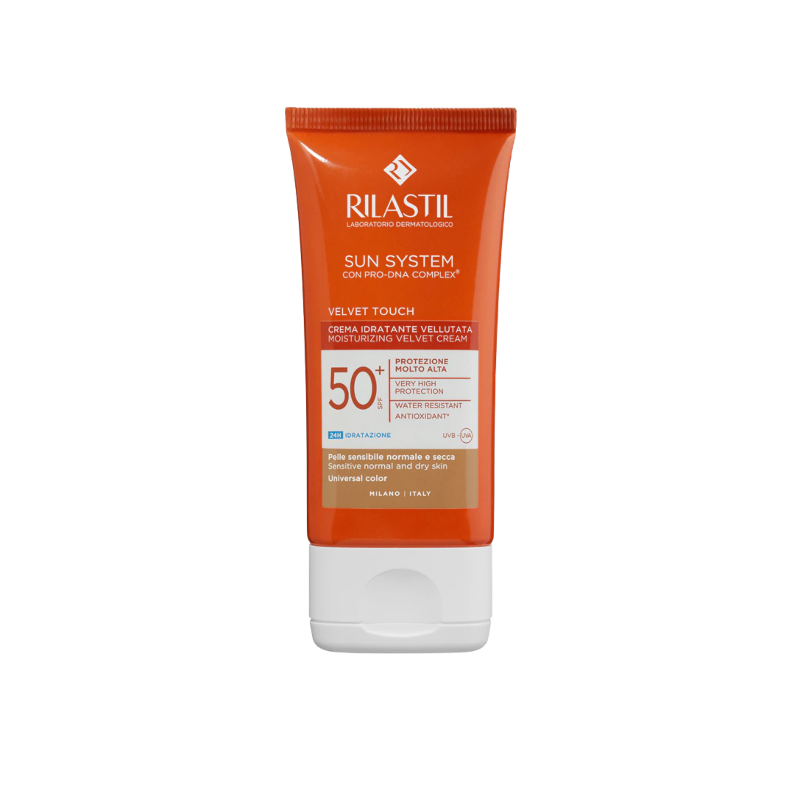 Rilastil Sun System Velvet Touch Universal Color SPF 50+ është një krem dielli për fytyrën me mbrojtje shumë të lartë, i formuluar për të ofruar mbrojtje efektive ndaj rrezeve UVA dhe UVB, duke ndihmuar në parandalimin e djegieve nga dielli, njollave të errëta dhe plakjes së parakohshme të lëkurës.