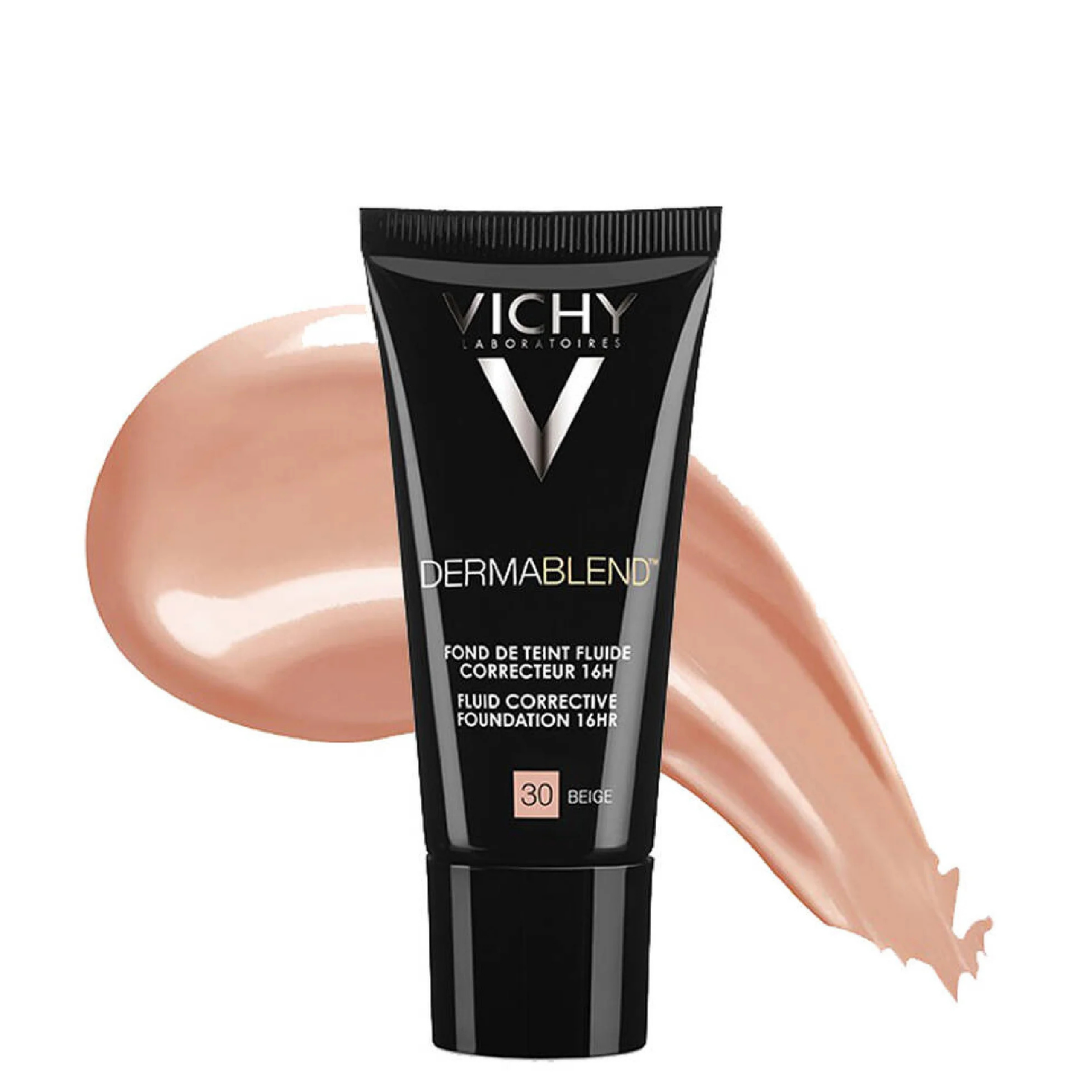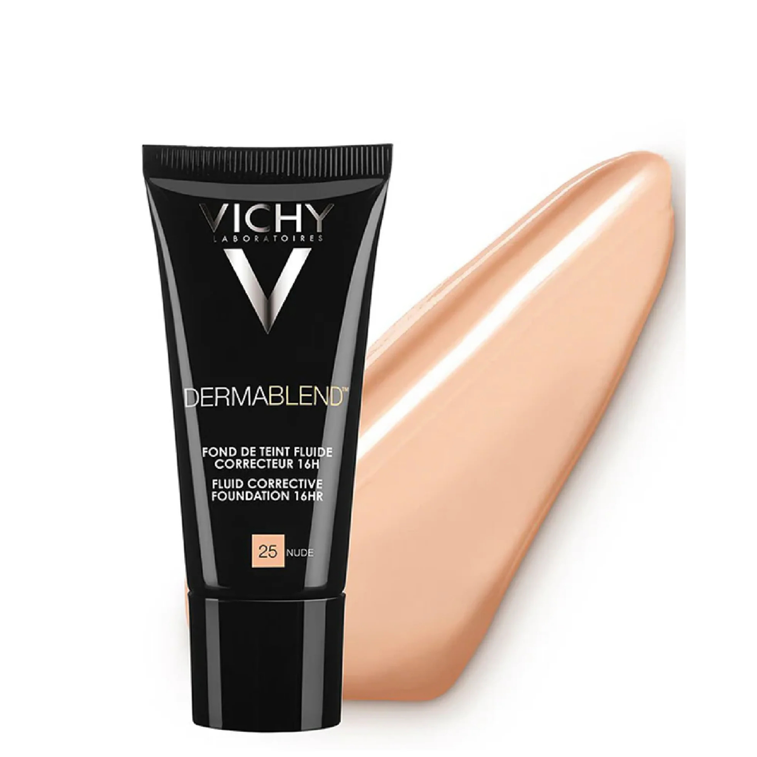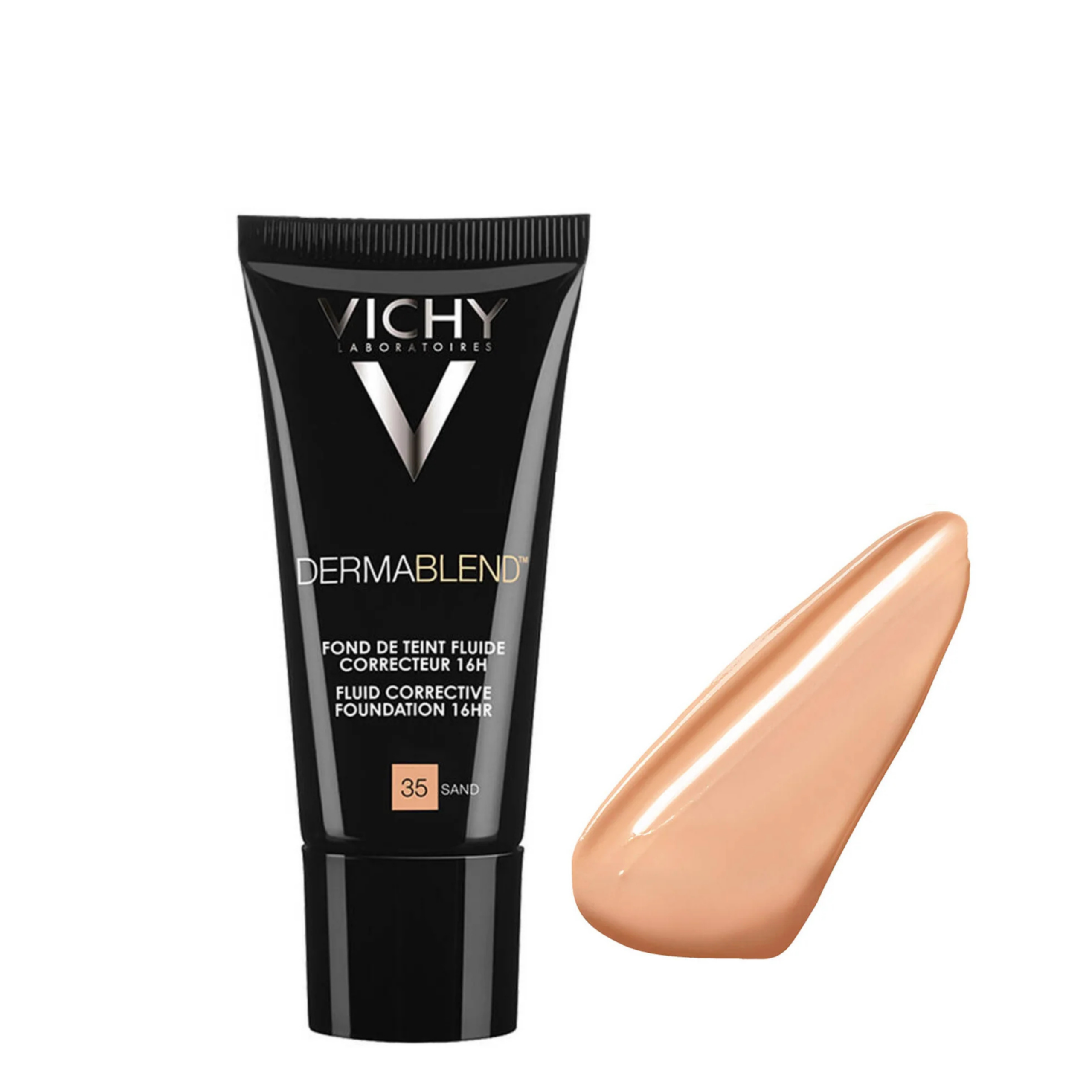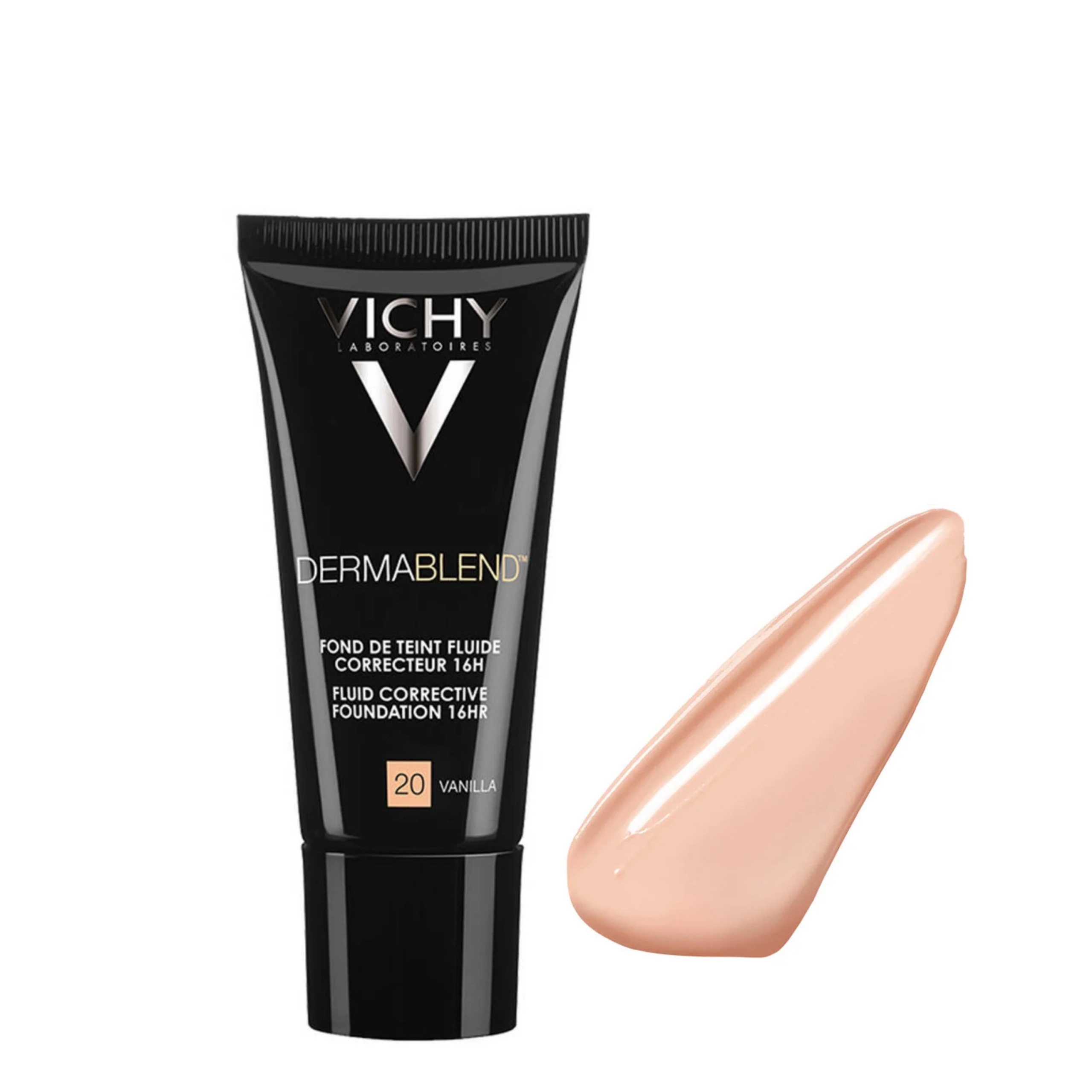 Vichy Dermablend është fondatina profesionale me mbulim të lartë, e krijuar për të ofruar një pamje të njëtrajtshme dhe natyrale gjatë gjithë ditës. Formula fluide përhapet lehtësisht, pa krijuar efekt “maskë”, ndërsa mbulon të gjitha papërsosmëritë e lëkurës si aknet, njollat, skuqjet, rrathët e errët, shenjat ose pigmentimet.