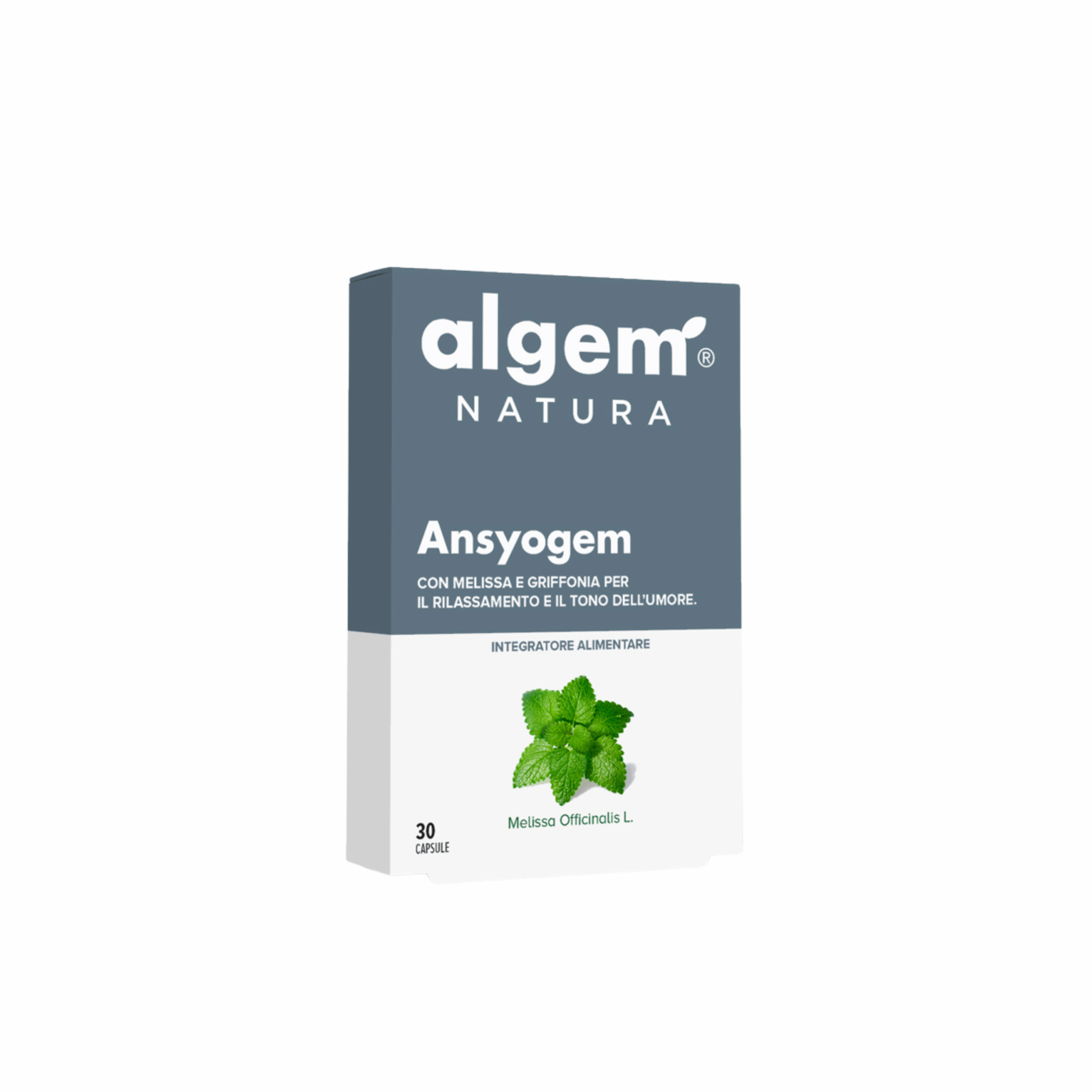 Algem® Natura Ansyogem është një suplement ushqimor në formë kapsulash, i krijuar për të mbështetur relaksimin, mirëqenien mendore dhe përmirësimin e humorit. Ky produkt përmban një kombinim të ekstrakteve bimore dhe peptideve detarë, të njohura për efektet e tyre pozitive në reduktimin e stresit dhe ankthit.
